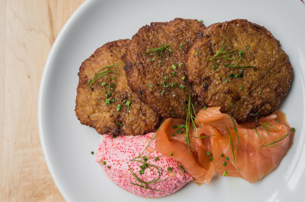 A favorite in Boerum Hill (Brooklyn) for their Montreal-style bagels, Mile End features latkes during Chanukah. Available for in-house dining, local delivery, and pick-up, the latkes come in basic latke form, on bagels, and as a complete meal such as the Mont Royal with latkes, smoked salmon, sour cream and tobiko. You can also order Hanukkah catering from the deli with dishes such as braised brisket, caramelized onion kugel, chicken schnitzel, and, of course, latkes.