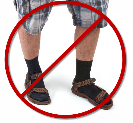 Don’t, under any circumstances, walk the streets of New York City wearing socks and sandals, no matter what the season.  Sandals can be fine, but use your judgment as flip flops may be more appropriately left for your beach visits.  And, please observe the socks-and-sandals corollary if you’re a male: never wear sandals into fine restaurants, theater, or any other upscale venue.  Women have it a bit easier here, as sandals (not flip flops) are acceptable as long as a pedicure has been recently enjoyed.