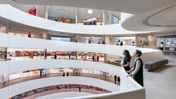 The Guggenheim’s Countryside: The Future by Rem Koolhaas was sadly postponed by the pandemic and part of the outdoor portion was removed. The exhibit is still solid, though, and the museum capacity is limited by time. The museum makes it easy for you to know how to view in safety. You can only head in one direction and arrows are indicated showing how to enter and exit a gallery. The arrows are also placed on staircases for exiting the museum after ascending the spiral. Should you not want to walk the stairs, the elevators are closely monitored. Another plus: many of the restrooms are single person only.