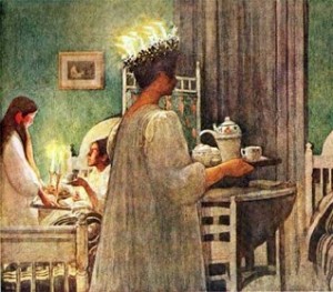 It seems my friends bribed the friendly doorman to allow them and Saint Lucia into the elevator. They slipped quietly up to the seventeenth floor and knocked on my door at about 6 am. It was a workday but my alarm wasn’t set to go off until 8 am. Sleepily, and with great curiosity and just a bit of fear, I looked out through the front door’s peephole but couldn’t see anything but lights. I buzzed the doorman who assured me that someone was indeed at my door and that it would be perfectly fine for me to let them in. As I opened the door, a very tall, very blond goddess-looking woman wearing a white flowing robe, a crown of lit wax candles on her head and a lit candle in her hand entered. Softly singing Christmas carols, my two friends entered behind her, while I stared, shocked and in total disbelief.