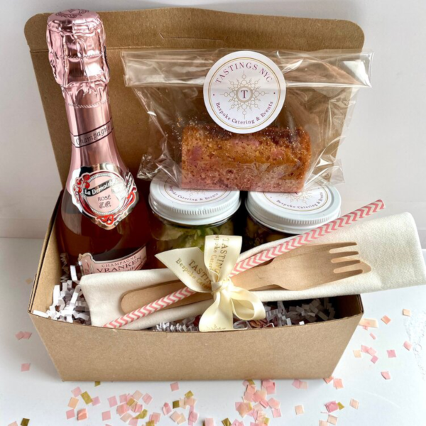Tastings NYC is the master of the portable picnic. To celebrate this beautiful time of the year, the Manhattan hospitality specialists have created the “Cherry Blossom Picnic,” a pretty-in-pink box of cherry blossom-influenced treats. Setting the stage are spring quinoa and roasted chicken, both with touches of pink. The final act is an adorable bag of mini strawberry pound cakes along with a pink beverage, your choice of a rosé Champagne or a rosé wine.